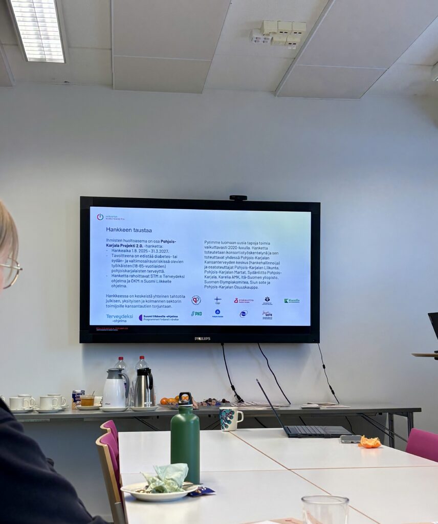 Seuraavaksi suuntasimme tien toiselle puolelle Pohjois-Karjalan kansanterveyden keskuksen tiloihin, joissa saimme kuulla sekä heidän että Pohjois-Karjalan Sydänpiirin toiminnasta. Opimme paljon uutta Sydänliitosta ja siitä, kuinka monen toimijan kanssa he tekevät alueellisesti yhteistyötä. Monelle Sydänliitto on tuttu Sydänmerkistä, mutta esittelyn jälkeen ymmärsimme hyvin, että toiminta ei keskity ainoastaan siihen. Ohjelma jatkui heidän yhteisen hankkeensa eli Pohjois-Karjala-projekti 2.0:n esittelyllä. Pääsimme kuulemaan hankkeen käytännön toteutuksesta ja oli mielenkiintoista kuulla, että hankkeessa on myös mukana ravitsemusterapeutti. Suosittelenkin tutustumaan tarkemmin hankkeeseen sekä Ihmisten huoltoasemaan, jossa annetaan maksutonta ja yksilöllistä elintapaohjausta. Esittelyjen lopussa oli aikaa vapaalle keskustelulle ja pääsimme molemmin puolin esittämään kysymyksiä sekä keskustelemaan ravitsemuksen tärkeydestä.