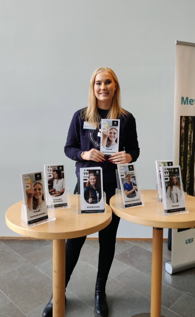 Kymmenen vuotta sitten meidän lukiolla kävi vierailulla ravitsemustieteen UEF-lähettiläs esittelemässä Itä-Suomen yliopiston tarjontaa. Kuulin silloin ensimmäisen kerran ravitsemustieteestä ja tiesin heti löytäväni oman alani. Epäröin kuitenkin, että uskallanko hakea ja muuttaa täysin vieraalle paikkakunnalle, josta en tiennyt käytännössä mitään – paitsi kalakukon ja sen kuuluisan Kuopion torin. Ajattelin abivuonna, että hakisin Jyväskylän yliopistoon, kuten monet muutkin ystäväni. Mutta jollakin maagisella tavalla Itä-Suomen yliopistosta jäi niin positiivinen fiilis, että sain rohkeutta hakea ja mennä kohti unelmieni alaa. Silloin ajattelin, että olisipa siisti olla joskus tuo tyyppi, joka pääsee inspiroimaan muita, ja tämän lukuvuoden aikana olen päässyt toimimaan UEF-lähettilään tehtävässä, ja olen päässyt kertomaan omaa hakutarinaani ja inspiroimaan ihmisiä hakemaan unelmien alalle.