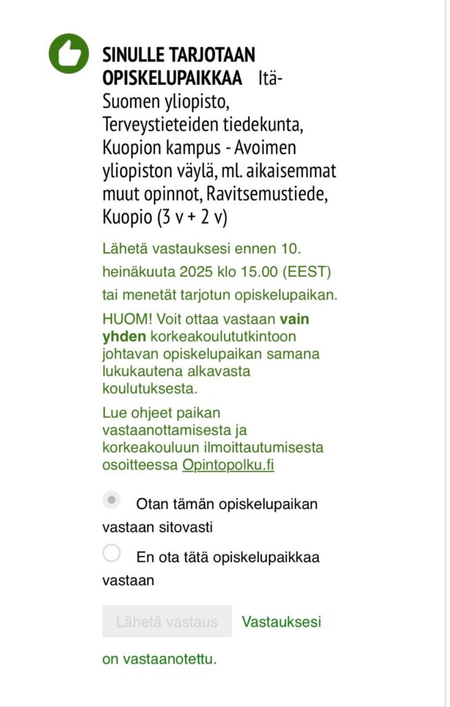 Älä stressaa, jos paikka ei aukea heti ensimmäisellä yrittämällä – varmasti moni muukin haaveilee opiskelupaikasta uuden avoimen väylän mahdollisuuden kautta. Tee rauhassa kursseja, jotka vievät sinua eteenpäin hakuprosessissa. Kurssit voit hyväksilukea opiskelemaan päästessäsi, jolloin olet jo pitkällä opinnoissasi ennen kuin olet edes aloittanut varsinaisena tutkinto-opiskelijana. <3
